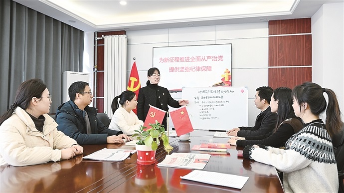 河南省洛陽市偃師區(qū)紀(jì)委監(jiān)委將學(xué)習(xí)新修訂的紀(jì)律處分條例作為今年紀(jì)律教育的“第一課”,推動(dòng)紀(jì)檢監(jiān)察干部深刻認(rèn)識(shí)修訂紀(jì)律處分條例的重要意義和豐富內(nèi)涵,將學(xué)習(xí)成果內(nèi)化于心、外化于行。圖為該區(qū)紀(jì)委監(jiān)委機(jī)關(guān)第五黨支部組織學(xué)習(xí)新修訂的紀(jì)律處分條例。 牛光衛(wèi) 攝