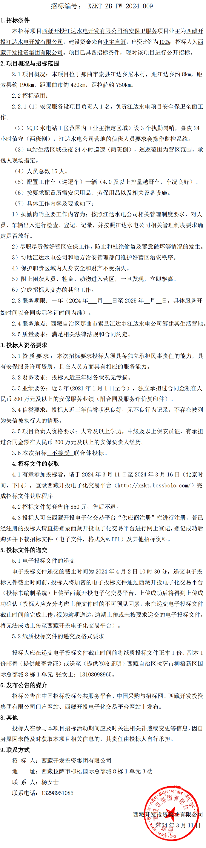 西藏開投江達水電開發(fā)有限公司安保服務(wù)招標(biāo)公告